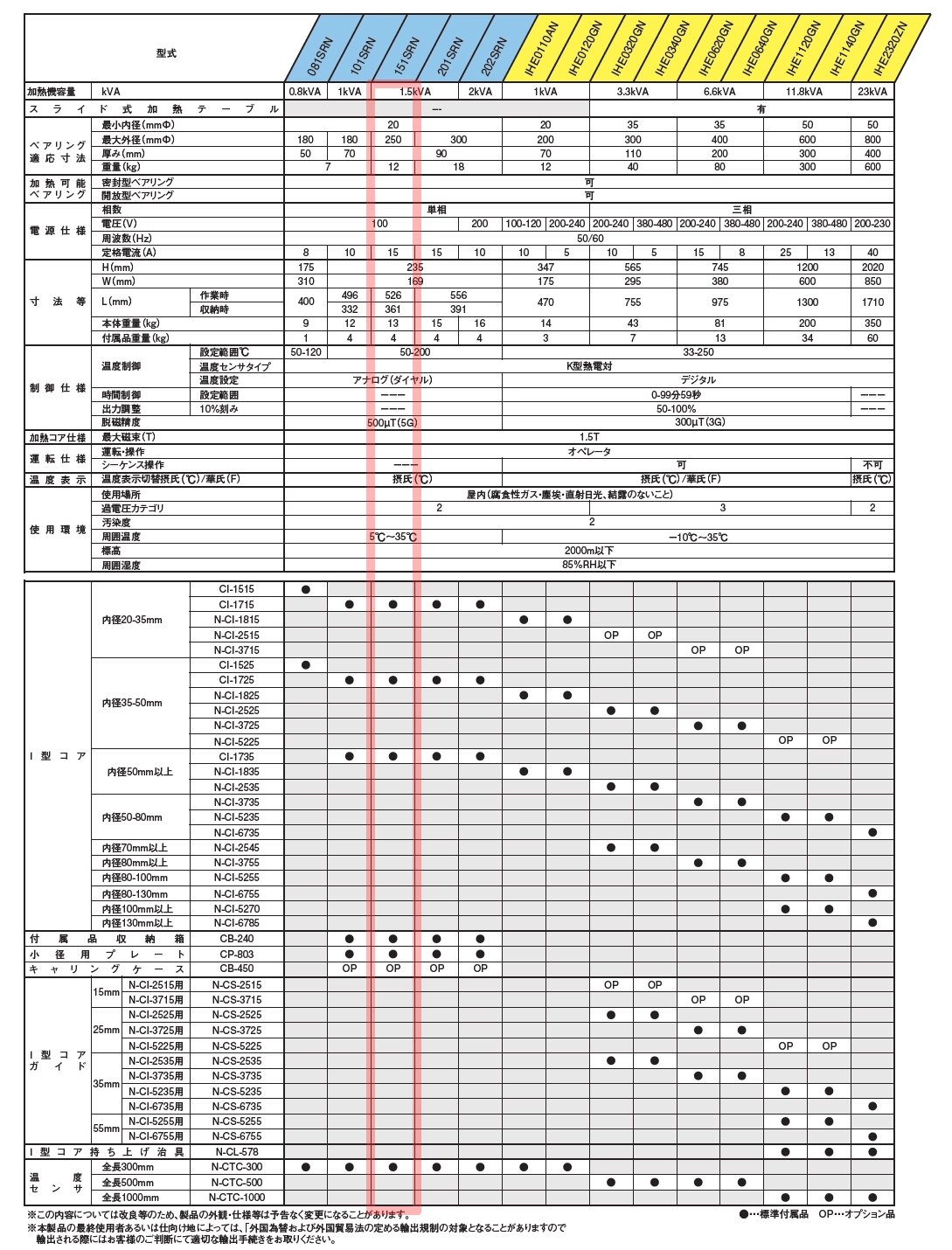 200℃までの加熱に対応しています。加熱の際に必要な温度センサが1本と、I型コアが3本、小径用プレートが1枚付属しており、付属品収納箱(CB-240)にまとめて収納することが可能です。また、別売オプション品にて加熱機本体と付属品収納箱(CB-240)をまとめて持ち運べるキャリングケース(CB-450)もご用意しております。 入力電源 151SRN単相100V ワーク適応寸法 最小内径(mmφ)20 最大外径(mmφ)250 厚み(mm)90 重量(Kg)12 仕様表