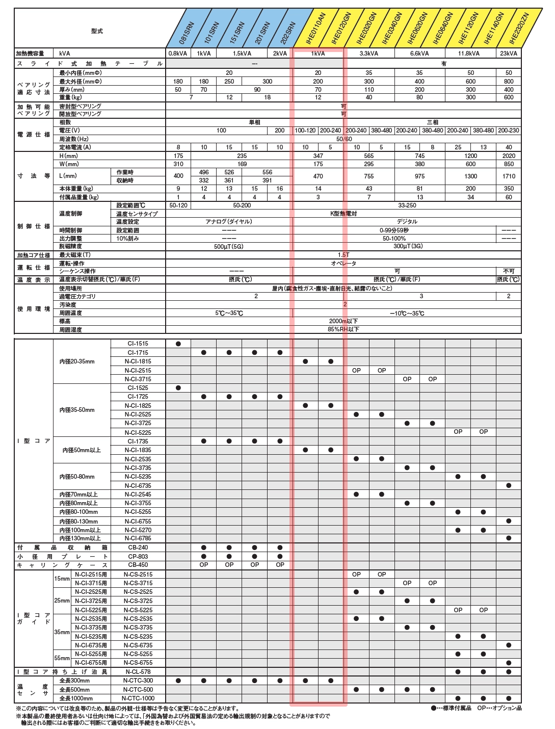 インバータ搭載により加熱効率に優れ、250℃までの加熱に対応しています。また、温度センサの断線や設置漏れを感知し自動停止するなど安全性能にも優れています。加熱の際に必要な温度センサが1本と、I型コアが3本付属しており、本体裏面の収納スペースにまとめて収納することが可能です。 入力電源 IHE0110AN単相100V IHE0120GN単相200V ワーク適応寸法 最小内径(mmφ)20 最大外径(mmφ)200 厚み(mm)70 重量(Kg)12 操作パネル 仕様表 付属品収納スペース I型コア、温度センサ設置時